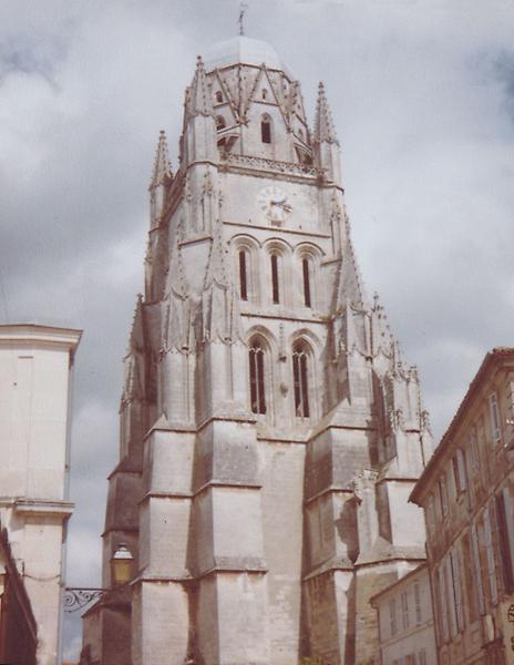 Vue vers le nord-est sur la ville fortifiée de La Rochelle. A gauche, la tour de la Lanterne puis le clocher Saint-Jean en travaux. A droite, les deux tours du port.