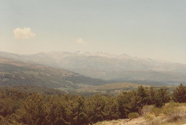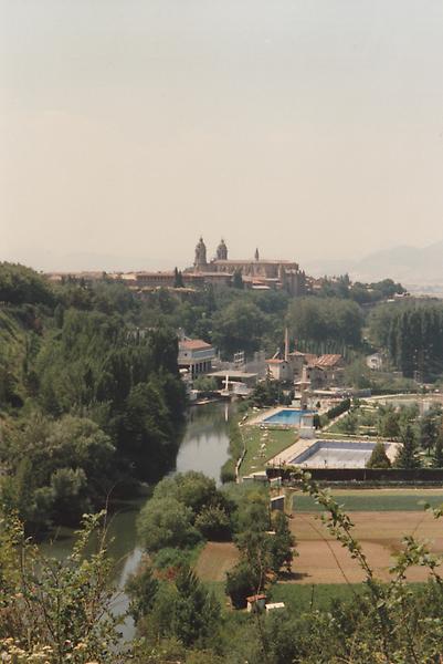 Depuis le Mirador de La Lastrilla, vue vers le sud-ouest sur la vallée de la rivière Eresma puis Ségovie sur son piton rocheux. A gauche, l'aqueduc romain. A droite, la cathédrale.