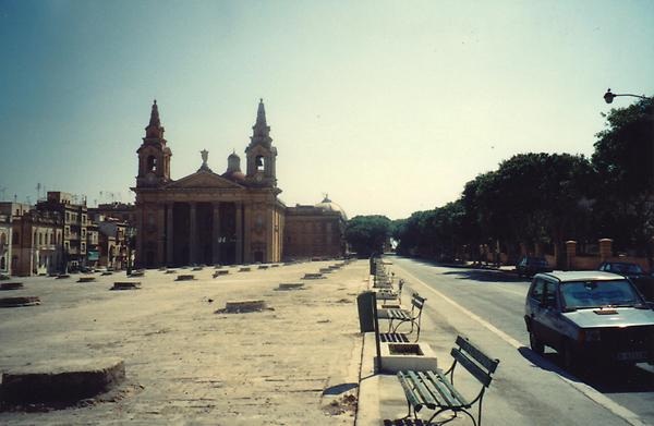 La place Saint-Publius de Floriana est une esplanade creusée de greniers fermés par des pierres et utilisés jusqu'au début du 20ème siècle. Au fond, l'église Saint-Publius puis le dôme de l'église Sarria de Floriana.