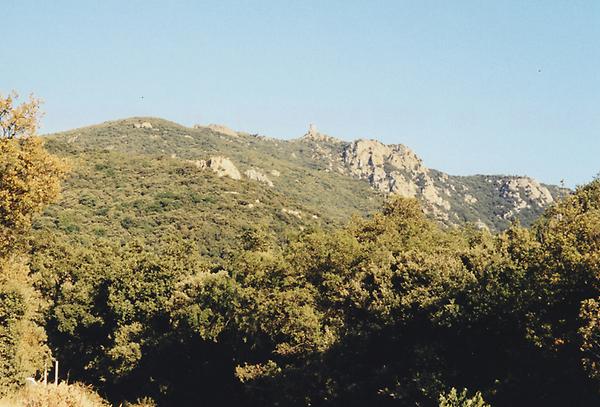 Depuis le bout du Cami de la Torre au sud-est du hameau de Lavall à Sorède, vue vers le sud-est sur la tour de la Massane (791m), une tour de guet du 13ème siècle, sur la limite communale entre Sorède et Argelès-sur-Mer.